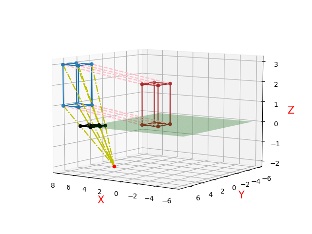 用蓝色图形表示原图形;红色图形表示透视移动后的图形;黑色图形表示投影结果;绿色平面是投影平面;粉色虚线表示进行透视所进行的变换对应关系;黄色虚线表示投影进行的变换关系。